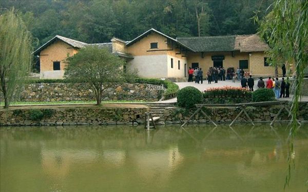 我们来看毛泽东同志故居。这是一栋坐南朝北、土木结构的典型南方农舍,它门临绿水,背依青山,成凹字型结构,这里老百姓称为‘一担柴’。当年这里居住着两户人家,东边13间小青瓦房为毛泽东家,西边四间茅草屋为邻居家,中间堂屋为两家共用,总计占地面积560余平方米,建筑面积470余平方米。